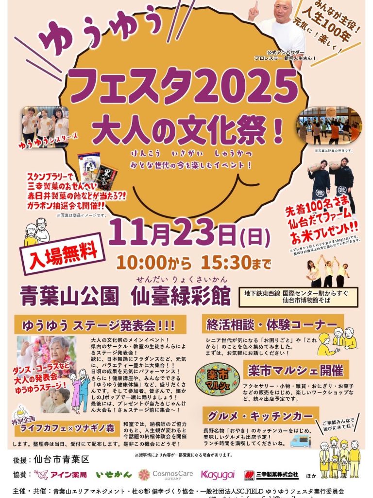 | 主催・共催 | 青葉山エリアマネジメント/杜の都健幸づくり協会/一般社団法人SC.FIELD /ゆうゆうフェスタ実行委員会 |