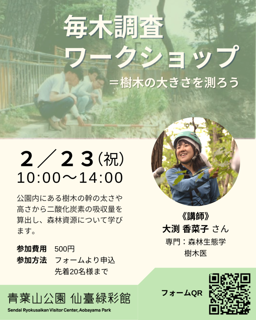| 内 容 | 青葉山公園の竜ノ口地区には、公園に植える樹木を育てる圃場の跡地があり、数十年が経ち不自然な森林となりました。1990年代に東北工業大学が毎木調査を実施してから約30年、森林生態学の専門家と公園内にある樹木の幹の太さや高さから二酸化炭素の吸収量を算出し、森林資源について学びます。 《講師》大渕 香菜子 さん |
